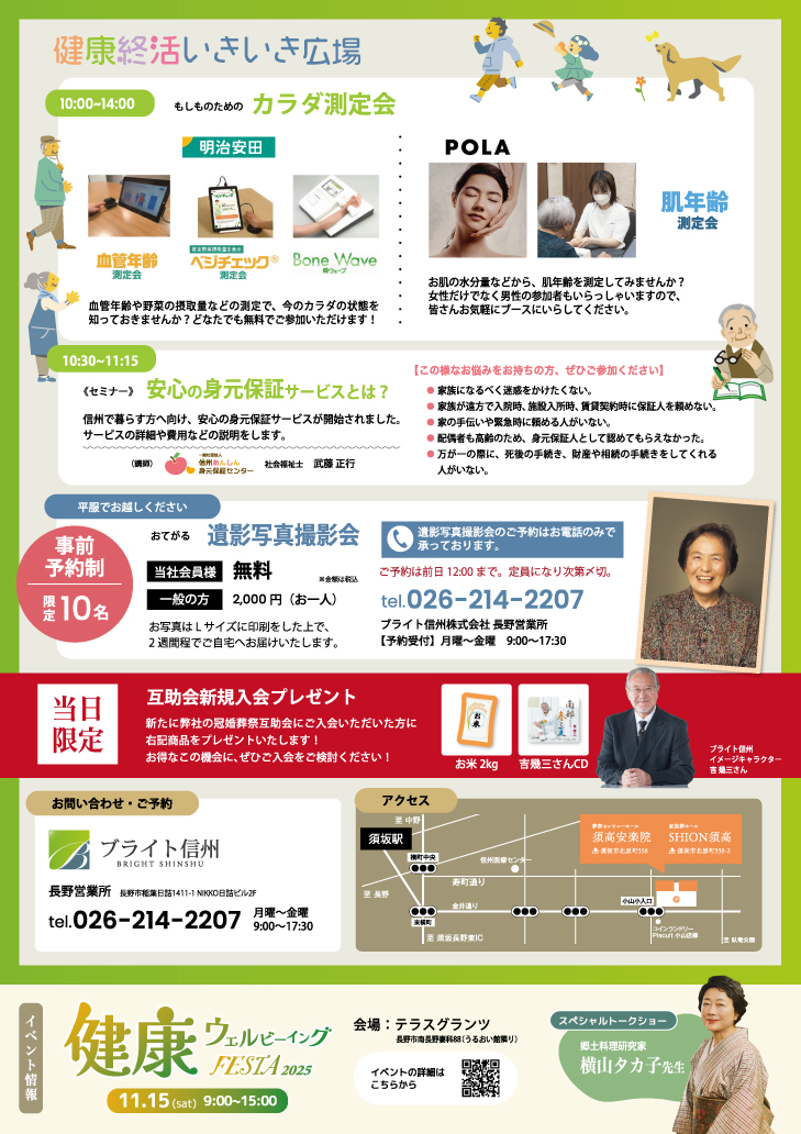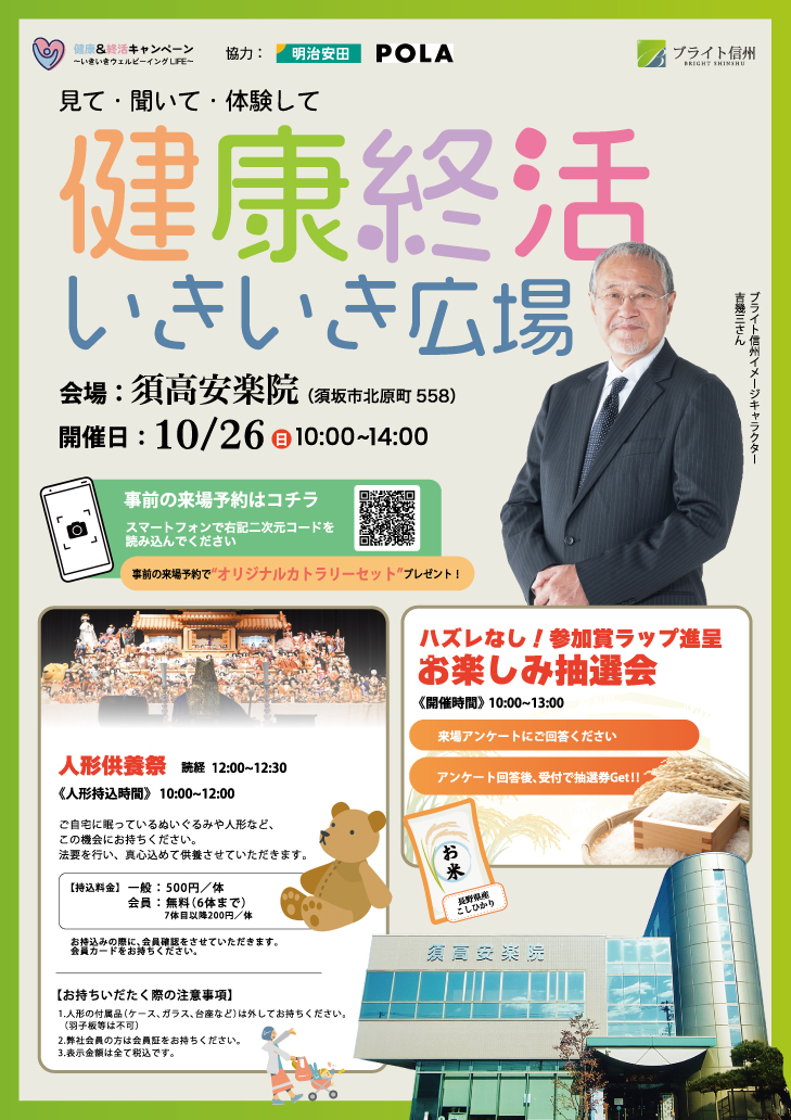 10月26日(土)に須高安楽院(須坂市北原町558)にて、「健康」と「終活」をテーマにした「健康終活いきいき広場」を開催いたします!